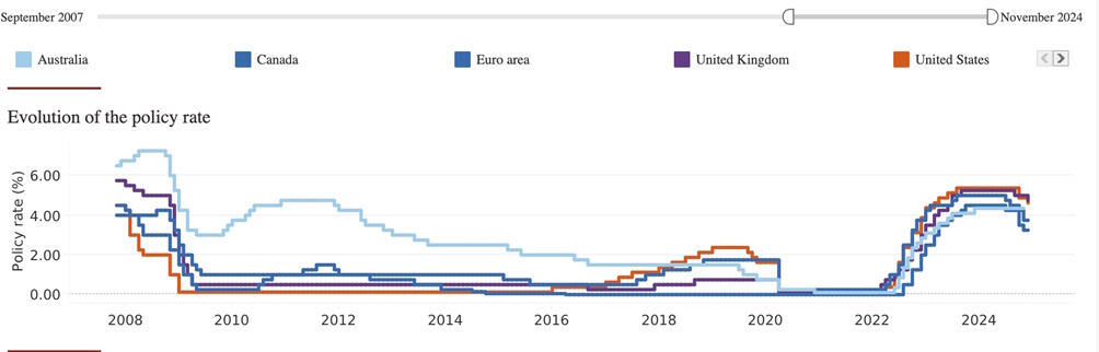 Global inflation and growth remain elusive as we enter 2025. One thing is for certain though, the recession expected by markets at the end of 2023 didn’t materialize in 2024. In fact, economies turned out to be more resilient than expected. Of course, some countries and therefore relevant investments did better than others, but overall, the theme was soft landing, and the central banks of developed countries started dropping their benchmark interest rates in 2024. Below graph shows how the leading central bank monetary policy rates have dropped since 2024 after hitting their peaks similar to those in 2007/2008 right before the Global Financial Crisis.