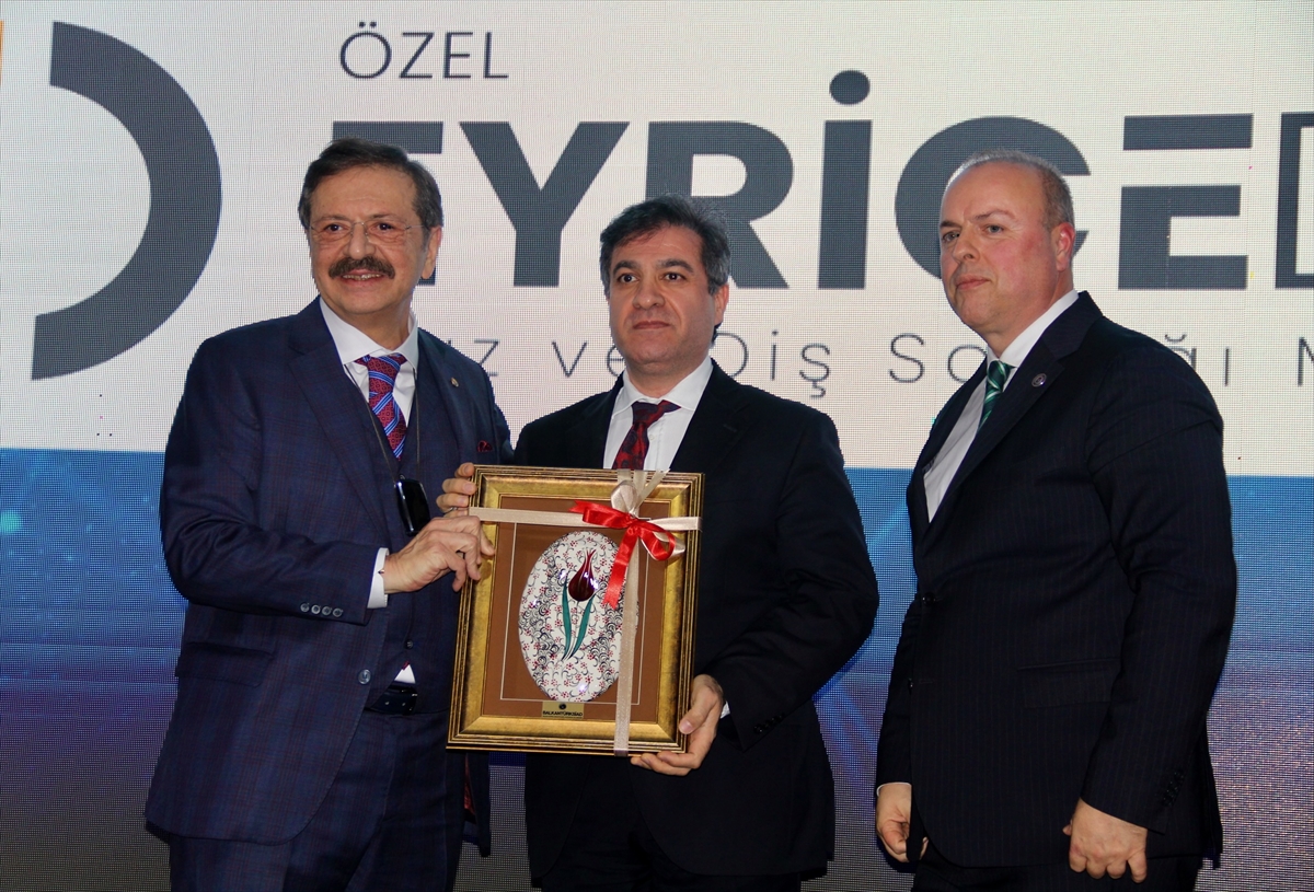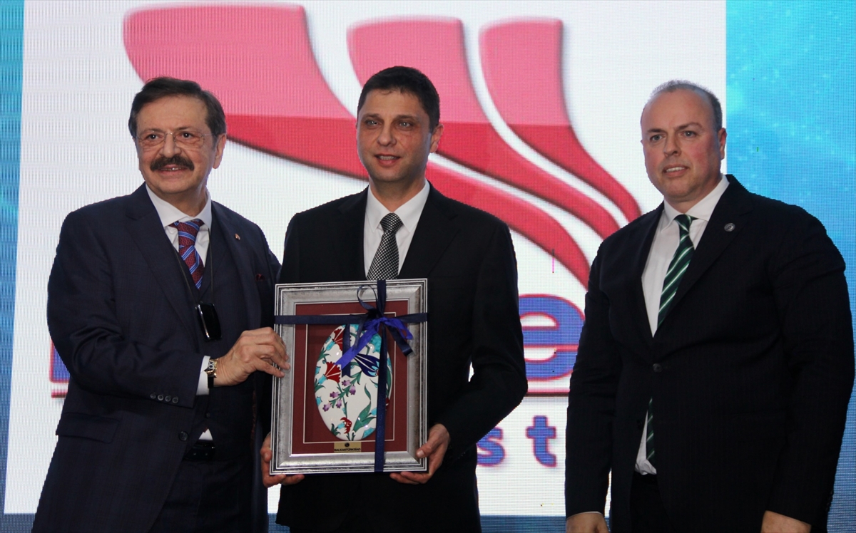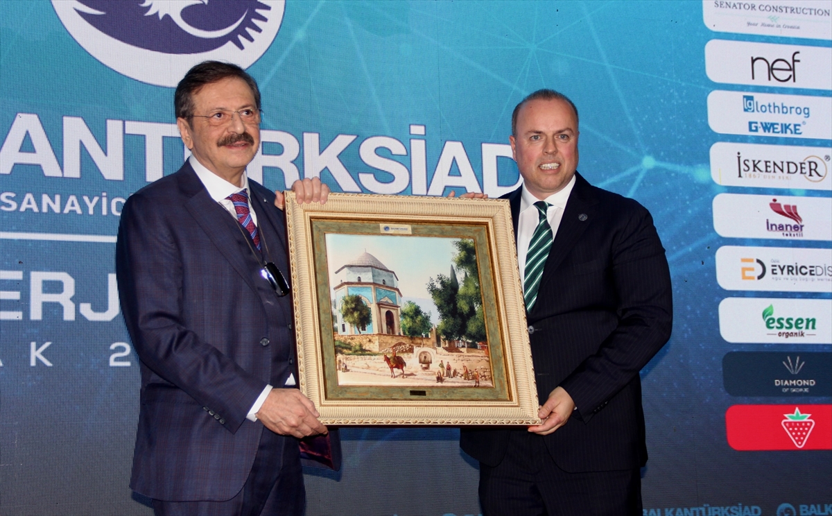 Konuşmanın ardından TOBB Başkanı Hisarcıklıoğlu ile BALKANTÜRKSİAD Yönetim Kurulu Başkanı Fatih Şakir, sponsor firmalara hediye takdim etti.