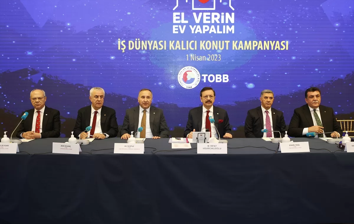 Hisarcıklıoğlu, TOBB İkiz Kuleler'de düzenlediği basın toplantısında, deprem bölgesine yönelik başlatılan konut seferberliğinin ayrıntılarını açıkladı. Toplantıda, TOBB Yönetim Kurulu üyeleri ve Türkiye Sektör Meclis başkanları da yer aldı.