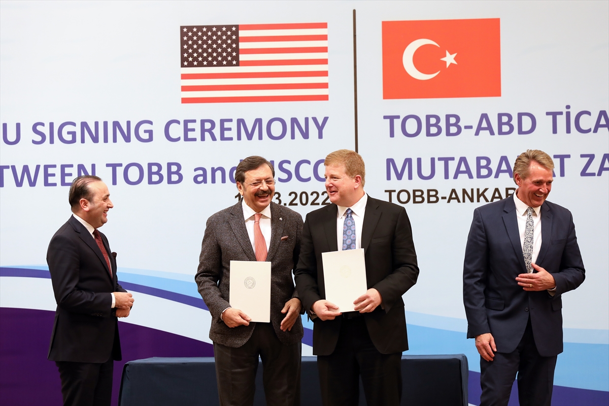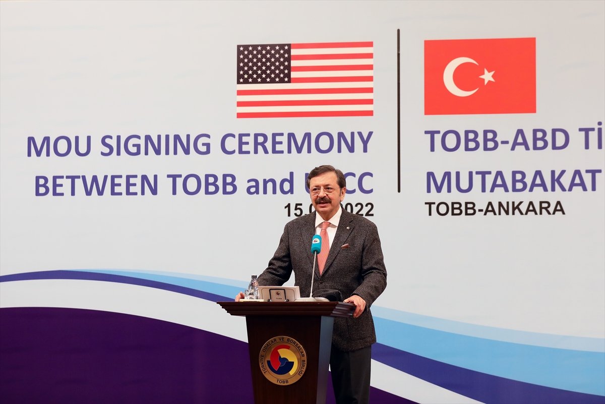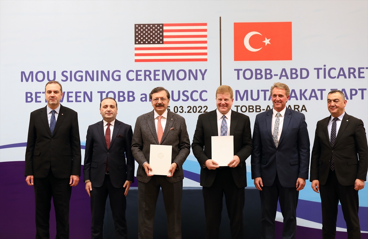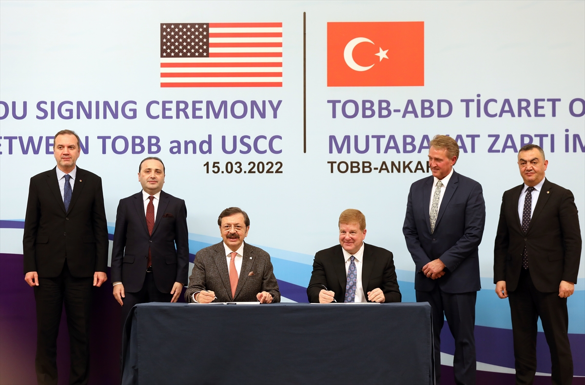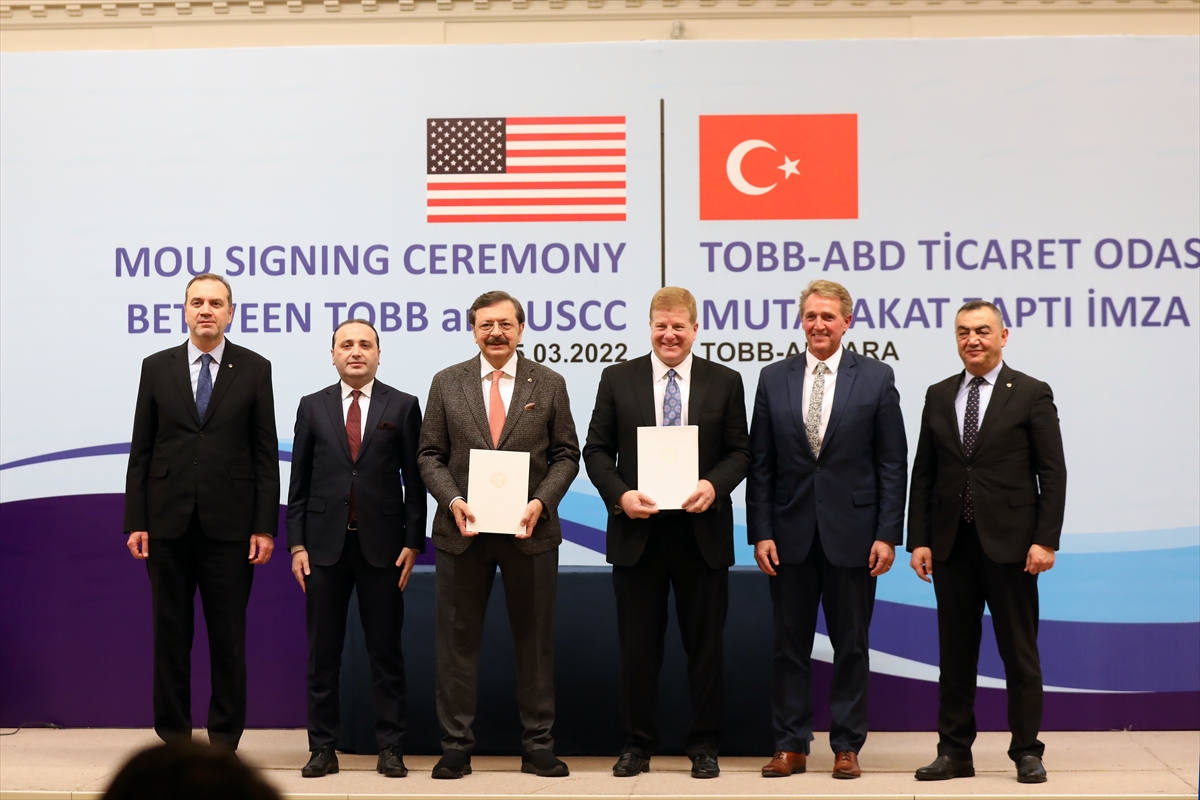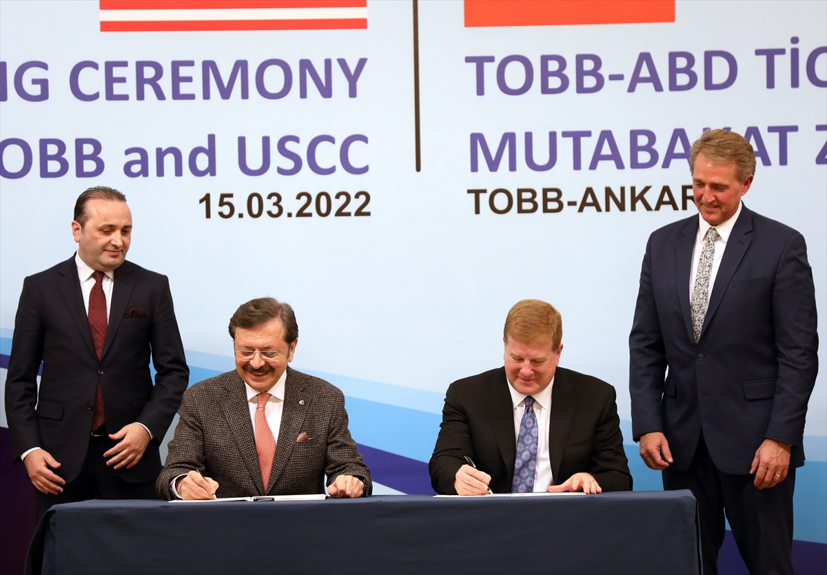 Türkiye Odalar ve Borsalar Birliği (TOBB) Başkanı Rıfat Hisarcıklıoğlu'nun davetiyle Türkiye'ye gelen ABD Ticaret Odası Kıdemli Başkan Yardımcısı Myron Brilliant'ın Ankara temasları kapsamında TOBB'da "TOBB-ABD Ticaret Odası Mutabakat Zaptı" imza töreni ve çalışma yemeği düzenlendi.