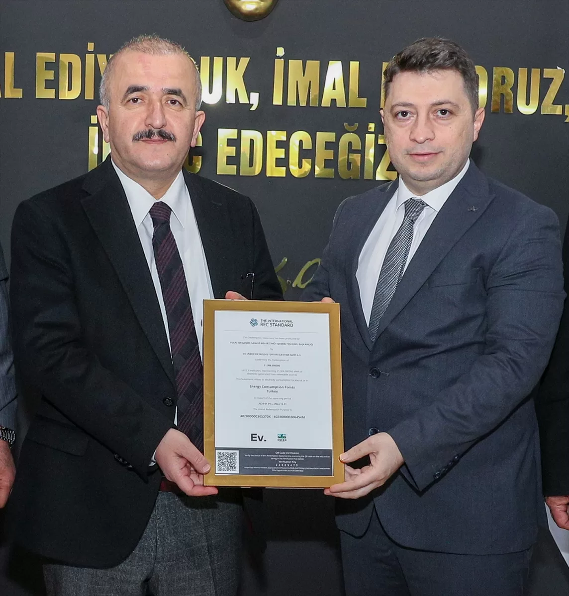 Tokat OSB Müdürlüğünde gerçekleştirilen I-REC sertifikası teslim töreninde, CK Enerji Çamlıbel Elektrik Genel Müdürü Muharrem Bülbül, aynı zamanda Tokat OSB Yönetim Kurulu Başkanı da olan Tokat Valisi Numan Hatipoğlu'na sertifikayı takdim etti.
