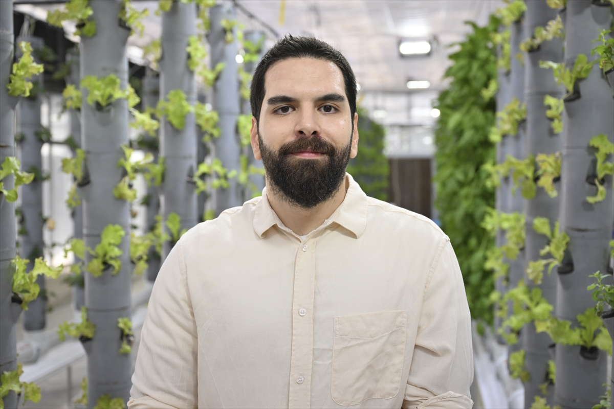 "Bu tesiste AR-GE kule dizilimi bulunuyor. Bu haliyle yaklaşık olarak 1500 bitkiye kadar çıkabiliyoruz. 40 metrekarelik bir alan düşünürsek oldukça verimli. Dikey yetiştiricilik dünyada uzun yıllardır uygulanan Türkiye'de belli yerlerde denenen bir sistem. Genel olarak yurt dışından malzemelerin temin edilmesi nedeni ile ilk kurulum maliyetleri yüksek olduğu için çok fazla uygulanan bir üretim çeşidi değil. Burada topraksız üretim yapılıyor, genellikle dikey tarım sistemlerinde ve topraksız tarımın da ana unsuru köklerin açık bir şekilde bulunması, su ve gübre karışımının da doğal olarak doğrudan köke gelip minimum su, minimum gübre tüketimi, aynı zamanda minimum enerji sarfiyatıyla bitkinin yetişmesi sağlanıyor."