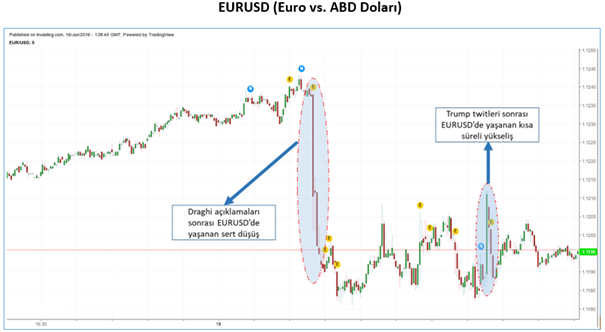 Geçtiğimiz gün Portekiz’deki yıllık AMB sempozyumunda konuşan AMB Başkanı Draghi yaşanan ekonomik yavaşlamayı durdurabilmek için negatif faize geçilebileceğini ve gerekirse parasal genişlemenin de planları dahilinde olduğunu açıkladı. Euro, bu açıklamayla beraber ABD Doları ve Türk Lirası gibi para birimlerine karşı değer kaybetti. ABD Başkanı Donald Trump ise Draghi’nin politika faizinin değişebileceğini açıklamasının hemen ardından twit atarak, Draghi’yi “kasıtlı olarak Euro’yu dolara karşı zayıflatmakla” suçladı ve bu yapılanın Amerika’ya yapılan bir haksızlık olduğunu belirtti.