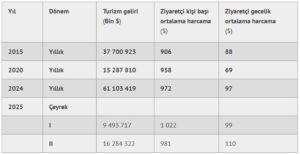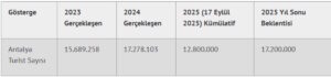2023 yılında Antalya, yabancı ziyaretçi sayısında tarihî zirvelerden birini gördü. 2024 yılında ise toplam ziyaretçi sayısı 17,28 milyonla tüm zamanların rekorunu yeniledi. 2025 yılında sezonun ilk yarısında yavaş bir başlangıç görülse de yaz aylarında günlük geliş sayılarında rekorlar kırıldı. Eylül ortası itibarıyla kümülatif 12,8 milyon seviyesine yaklaşıldı. Bu görünüm, yıl sonu için 17–17,5 milyon bandını mümkün kılıyor.