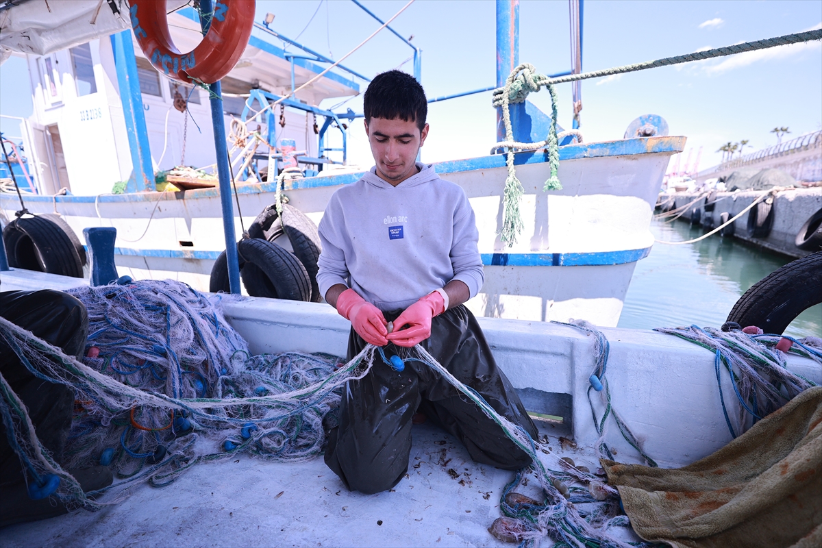 Yasakla beraber Mersin Balıkçı Barınağı'na teknelerini demirleyen balıkçılar, topladıkları ağların tamirini ve motorlarının bakımını yaptı.