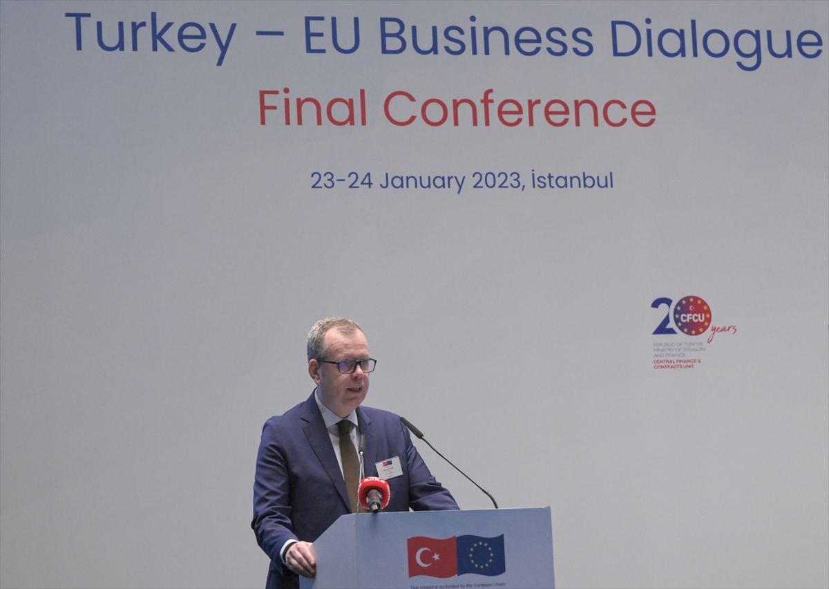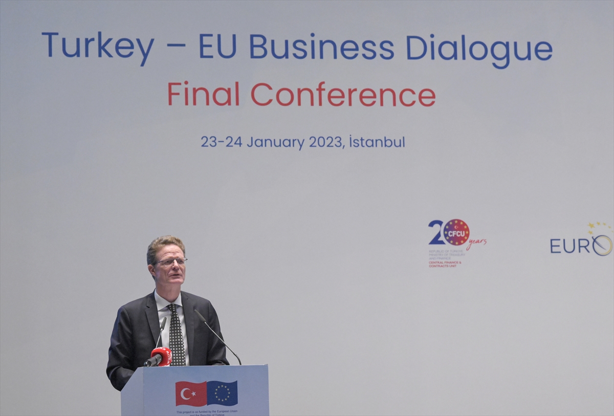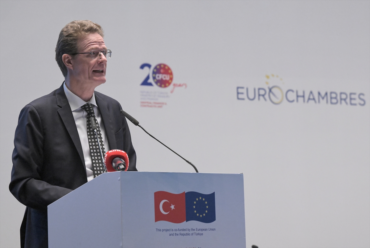 "AB ülkeleri Türkiye'ye yakın ama sadece yakınlık önemli değil. Altyapı, demografik avantaj, girişimcilik ruhu da AB iş camiası için önemli. Türkiye ve AB iş dünyası diyaloğuna benzer projeler sayesinde karşılıklı olarak ekonomilerimizi daha iyi tanıyacağız ve birbirimize faydalı olacak şekilde ticari ilişkilerimizi geliştirebileceğiz. Bu sebeple TOBB ile birlikte son 4 yıldır bu projeyi sürdürmekteyiz. Bu projede her iki taraftan iş dünyası temsilcileri pek çok aktivitede bir araya geldi, bugün ve yarın aktivitelerin sonuçlarını dinleyeceğiz. Yeşil ve dijital dönüşüm, iki ekonomi arasında potansiyel barındıran alanlardan biri. Önümüzdeki yıllarda da bu alanlarda çalışmalar yapmaya devam edeceğiz. Geçtiğimiz 4 yıl kolay olmadı. Farklı sebeplere bağlı olarak bu 4 yılı hep zor yıllar olarak tanımlamaya devam edeceğiz. Bu 4 yıl içerisinde en yüksek katkıda bulunmuş iş ortaklarımıza teşekkür ediyorum."