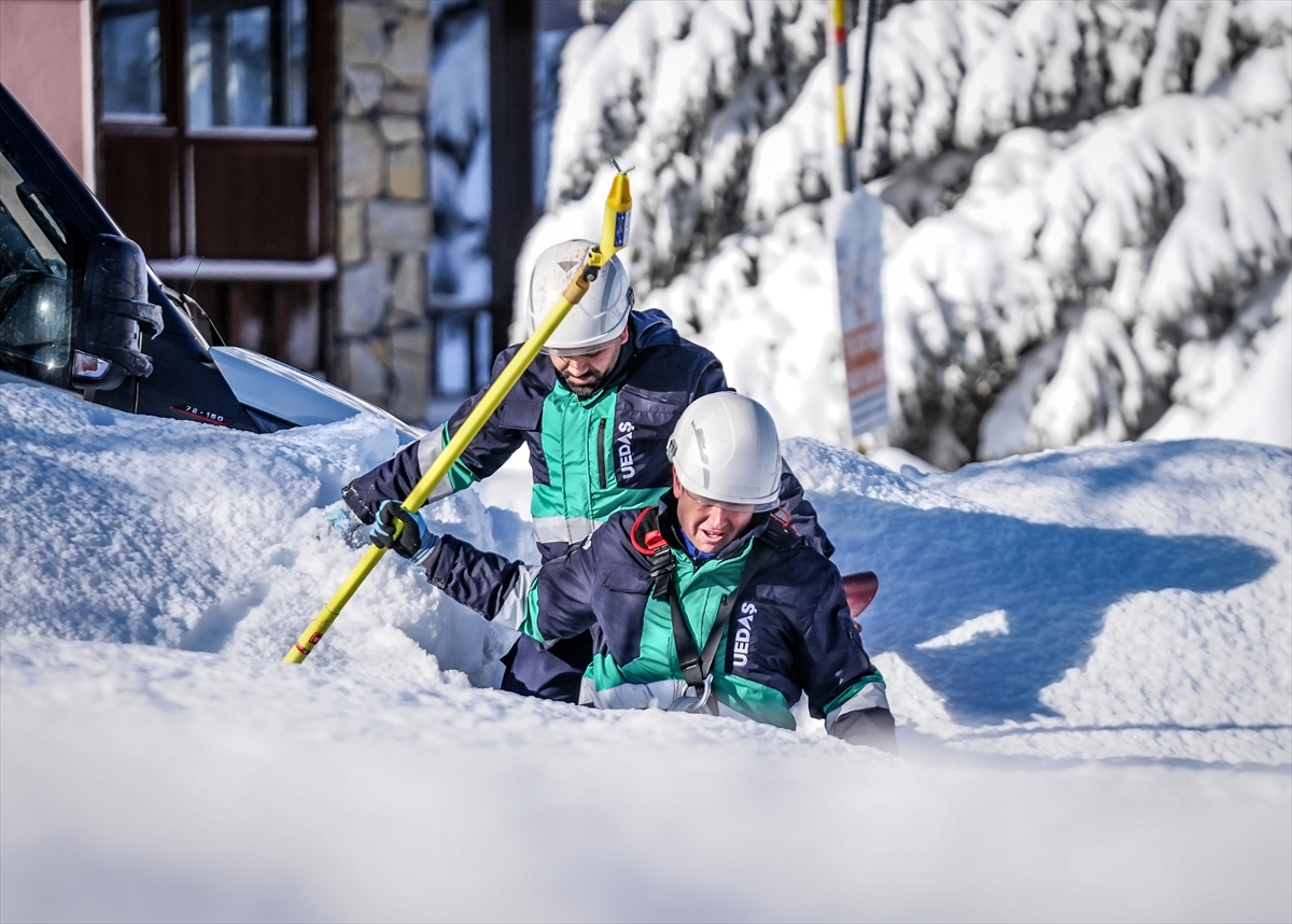 Uludağ Elektrik Dağıtım AŞ (UEDAŞ) ekipleri, kar kalınlığının 95 santimetre ölçüldüğü Uludağ'da yoğun kar yağışının etkisiyle yaşanabilecek olası arızalara karşı enerji sürekliliğini sağlamak için sepetli araçların yanı sıra arazi araçlarıyla görev yapıyor.