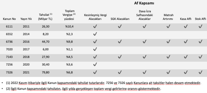 Halen taksit ödemeleri devam eden son geniş kapsamlı af 2021’de 7326 sayılı Kanun ile çıkarılmıştı. O da 2020 ve önceki yılları kapsamına almıştı. Bu durumda, sadece zamanaşımı sınırları içinde kalan 2021 ve şu günlerde kapanış işlemleri devam eden 2022 yılları vergi incelemesi riski altında bulunuyor.