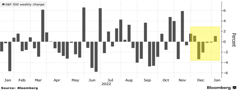 The chart below that illustrates the weekly returns of the US equity index SP500 is a good depiction as to how last year has turned out to be a roller coaster for its investors. Every time the markets got a bit optimistic and started buying, the next thing they knew was the markets just plummeting again.