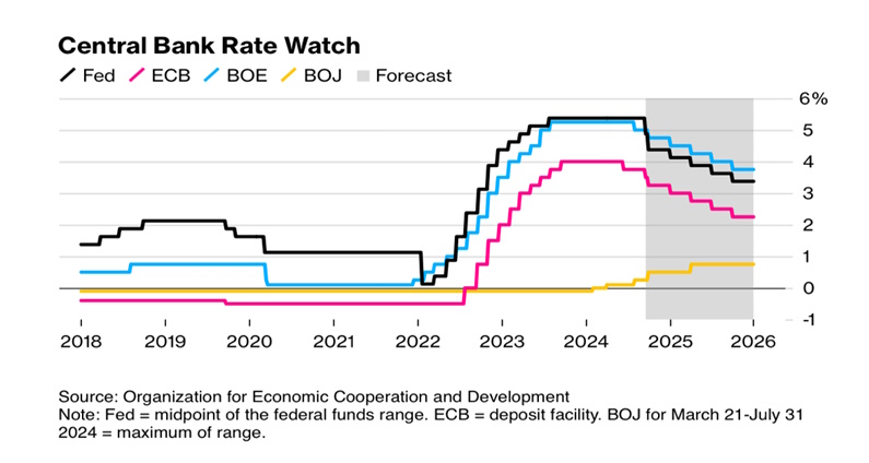 Despite looming inflation, OECD expects more rate cuts for the FED, Bank of England (BOE), European Central Bank (ECB) over the next few years. See the graph below.