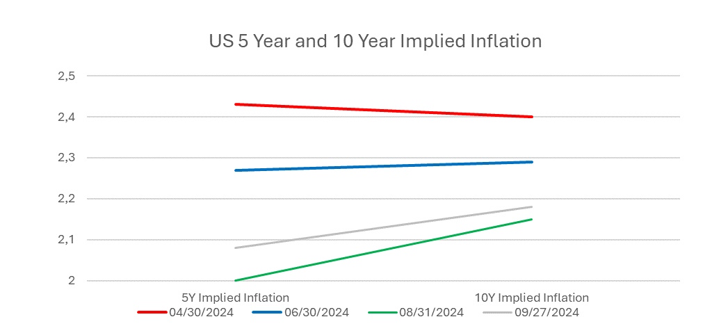 So far, the drop in nominal rates has been due to a drop in expected inflation which is illustrated in the graph below and covered in our earlier issues. In September, the story changed slightly. As illustrated in the graph below, the longer term expected inflation inched up in September (gray line) vs. August (green) as FED addressed the lower implied inflation by reducing its benchmark interest rate. However, the nominal yields still dropped. Why? Because even though expected inflation went up, the long-term real rates dropped as the expected long-term cost of financing dropped alongside lower FED rate. As the drop in real rates was bigger than the increase in implied inflation, the nominal yields dropped as well. As a reminder, nominal rate = expected inflation + real rate.