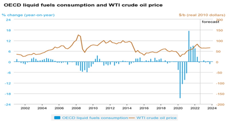 The Organization of Economic Cooperation and Development (OECD) consists of the United States, much of Europe, and other advanced countries including Turkey. At 46% of world oil consumption by end of 2021, these large economies consume less oil than the non-OECD countries. While oil prices and OECD consumption have a close relationship, it is not necessarily clear which one impacts the other. For instance, while OECD consumption dropped due to higher oil prices during the 2008 crisis, oil prices dropped in 2020 and 2021 alongside the visible reduction in OECD demand during the Covid pandemic.