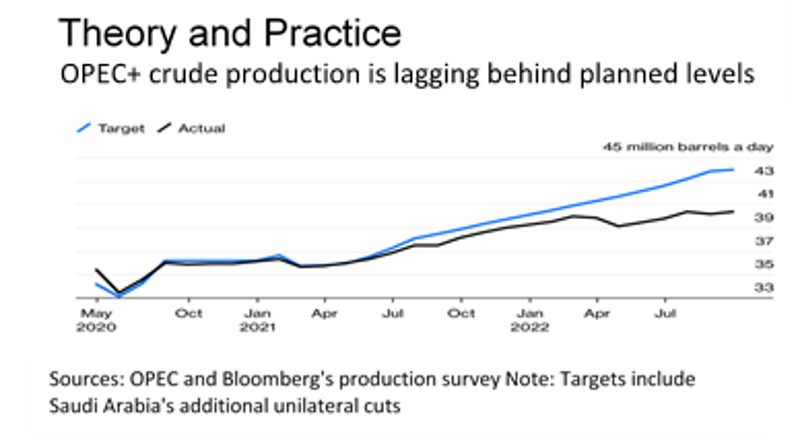There is also the fact that this projected cut is based on “target” production level which is different and already higher than what the countries are actually producing. OPEC+’s September production estimates suggest that the actual production is already below the target levels by about 3.6 million barrels a day so the 2 million barrel cut would have only a negligible effect.