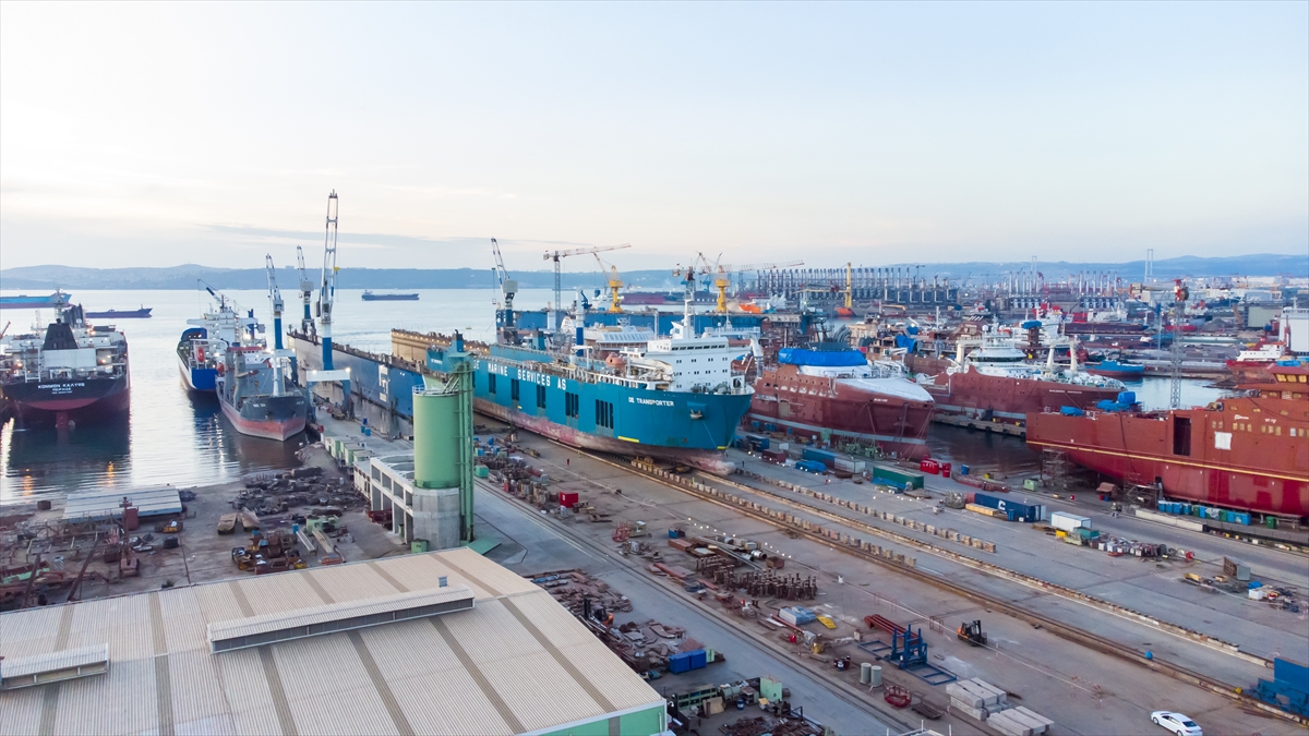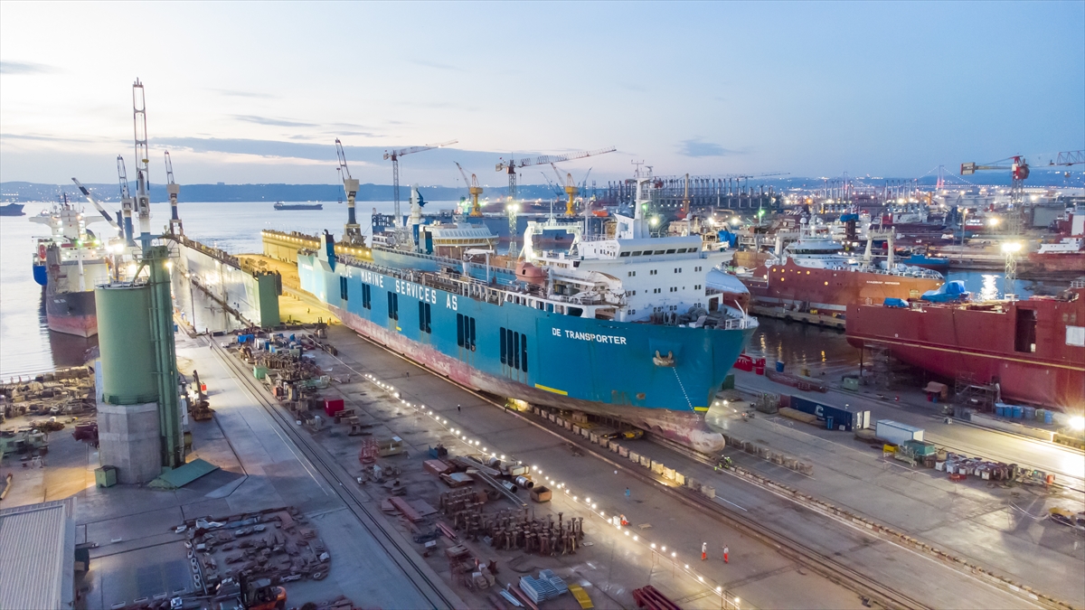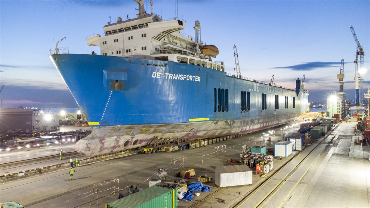 Tersan firmasınca değerlendirilmek üzere alınan 180 metre uzunluğunda, 16 metre yükseklik ve 27 metre genişliğindeki "De Transporter" gemisi, tersanenin yüzer havuzuna getirildi.