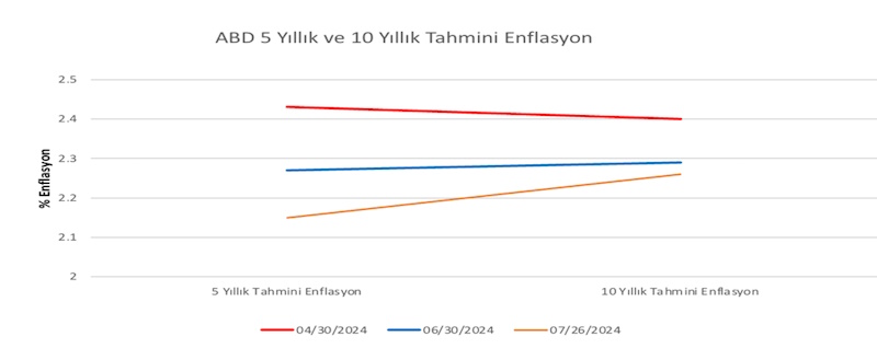 Okurlarımızın önceki sayılarımızdan da hatırlayacağı gibi, herhangi bir vade için tahmini enflasyon, nominal faizlerin göstergesi olan o vadeli ABD tahvili getiri faizi ve reel faiz oranının göstergesi olan gene aynı vadeli ABD Hazinesi Enflasyon Korumalı Menkul Kıymetler (Treasury Inflation-Protected Securities veya TIPS) kullanılarak hesaplanır. Aynı vadeli iki faiz oranı arasındaki fark, piyasalar tarafından o vadede beklenen tahmini (veya başa baş) enflasyonu verir (örneğin 5 yıllık nominal getiri faiz oranı – 5 yıllık reel faiz oranı = 5 yıllık tahmini enflasyon).