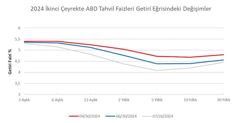 Mayıs ve Haziran ayında olduğu gibi Temmuz ayında da tahvil fiyatları yükseldi. Temmuz ayında en kayda değer hareket, ABD tahvil faizi getiri eğrisinin (aşağıdaki grafikte gri çizgi) Nisan ayına (kırmızı çizgi) ve Haziran ayına (mavi) kıyasla daha da negatif eğimli hale gelmesi oldu. Bu da, grafikte de görüldüğü üzere son birkaç aydır uzun vadeli faizlerin düştüğü anlamına geliyor.