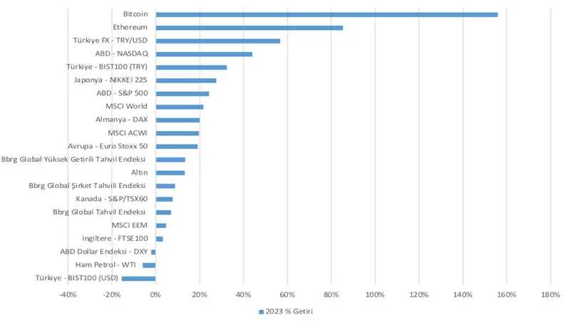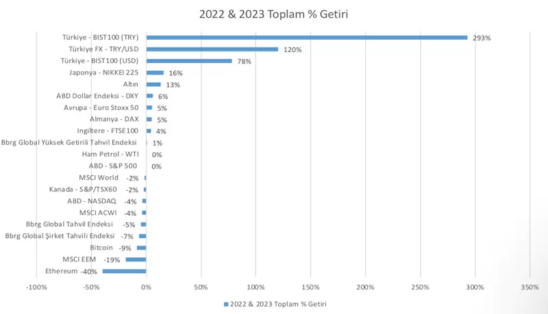 Yukarıda verdiğimiz Bitcoin getirisi örneğini ilginç bulduysanız, o zaman aşağıdaki tabloda belli başlı yatırım araçlarının 2023’teki getirilerine ve bir sonraki tabloda Bitcoin’deki gibi son iki yıldaki toplam getirilerine bir göz atın.