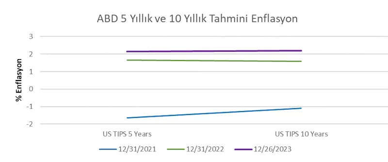 2023’ün sonuna geldiğimizde yüksek seyreden sadece tahvil faiz getirileri değildi. ABD uzun vadeli enflasyon beklentileri (aşağıdaki grafikteki mor çizgi) de yüksek seyretmeye devam etti.