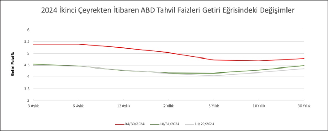 Trump’ın ABD ekonomisini daha rekabete dayalı hale getirme, doları güçlendirme ve genel olarak vergileri azaltma hedefi ABD hisselerini körükledi. FED’in faiz indirimlerine devam edeceği beklentisi de fiyatları destekledi. 29 Kasım itibarıyla ABD hisse senedi endeksi S&P 500 aylık bazda +%5,7 gibi hatırı sayılır bir artışla yıl başından bu yana getirisini +%26,8’e çıkardı. Öte yandan Avrupa hisse senedi endeksi, zayıf makroekonomik koşulların devam etmesi nedeniyle Kasım ayında geriledi. Euro Stoxx 50 aylık bazda -%0,5 düşerek yıl başından bu yana getirisinin +%6,3’e gerilemesine neden oldu. Global gelişen piyasalar hisse senedi endeksi MSCI EM Kasım ayında yaşadığı -%2,7 düşüşle yıl başından bu yana +%7,6’ya geriledi. Avrupa ve gelişen piyasalardaki gerilemeye rağmen global hisse senedi piyasaları göstergesi MSCI All Country World Index (ACWI) Kasım ayında +%4 artışla yıl sonundan bu yana +%19,7’lik bir getiri sağladı.