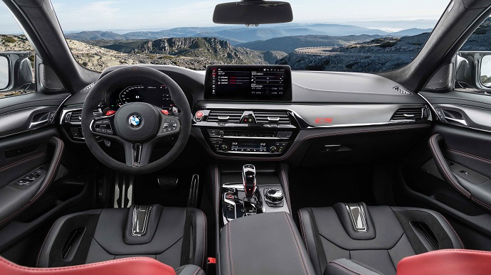 Yeni BMW M5 CS’deki olağanüstü sürüş deneyiminin keyfini M Carbon koltuklarda oturan sürücü ve yolcular en üst seviyede yaşarken, siyah Merino deri kaplamalar Mugello Kırmızısı dekoratif dikişlere sahip. Ön koltuklar için aydınlatmalı M5 logoları içeren entegre koltuk başlıkları, efsanevi Nürburgring pistinin silüetini yansıtıyor. M Alcantara direksiyon simidinin üzerinde bulunan vites değiştirme kanatçıkları karbon fiberden üretilirken, direksiyon simidinin kollarında kullanılan siyah krom kaplamalar ise Yeni BMW M5 CS’in sıra dışı performansına vurgu yapıyor.